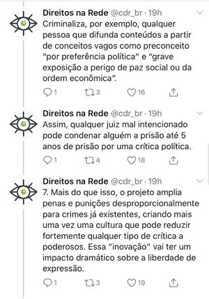 No dia 22 de junho de 2020, Leonardo Sakamoto ([1]), colunista da Uol, e a organização de ativistas e acadêmicos em defesa da internet, Direitos da Rede ([2]), publicaram no Twitter contra o PL.